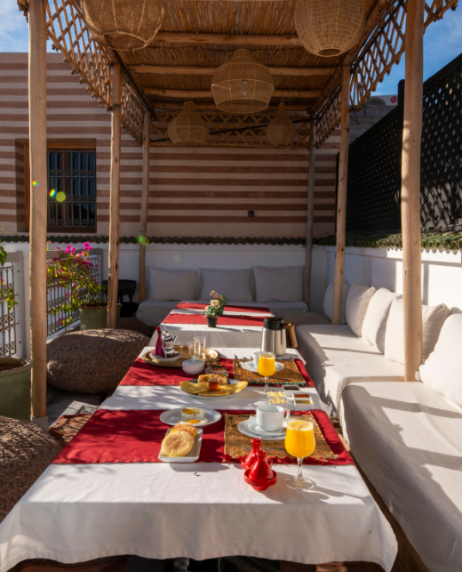 Savourez un dîner traditionnel dans une ambiance conviviale, au bord du patio ou sur la terrasse, pour une expérience culinaire typiquement marocaine.